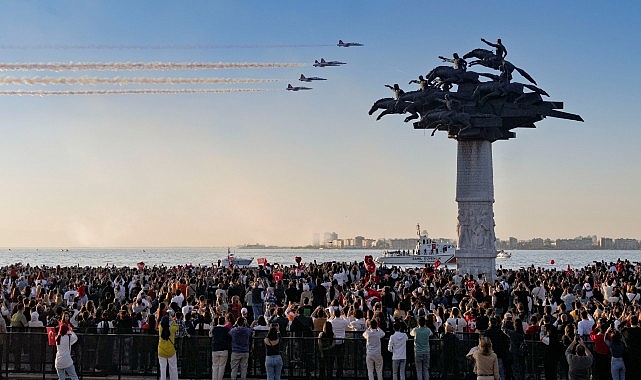 İzmir’de gün boyu süren 29 Ekim Cumhuriyet Bayramı kutlamaları, Türk Hava Kuvvetleri’nin gururu Türk Yıldızları’nın gösterisiyle devam etti. Gündoğdu Meydanı’nda toplanan binlerce İzmirli, yurt içinde 500’üncü gösterisini yapan Türk Yıldızları’nı heyecanla takip etti. 5 uçakla gösteri yapan Türk Yıldızları, Cumhuriyet coşkusunu zirveye çıkardı. Yurttaşlar, hem meydandan hem de evlerinden bayraklar ve marşlarla gösteriye eşlik etti.