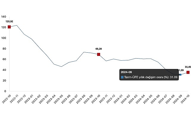 Tarım-ÜFE’de (2020=100), 2024 yılı Ekim ayında bir önceki aya göre %5,03 artış, bir önceki yılın Aralık ayına göre %26,32 artış, bir önceki yılın aynı ayına göre %35,46 artış ve on iki aylık ortalamalara göre %49,55 artış gerçekleşti.
