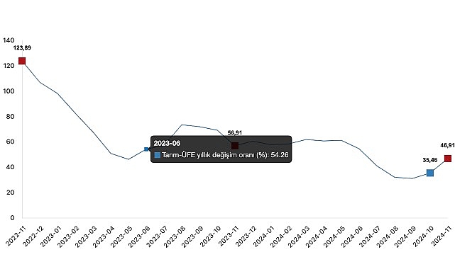 Tarım-ÜFE’de (2020=100), 2024 yılı Kasım ayında bir önceki aya göre %8,88 artış, bir önceki yılın Aralık ayına göre %37,55 artış, bir önceki yılın aynı ayına göre %46,91 artış ve on iki aylık ortalamalara göre %48,83 artış gerçekleşti.