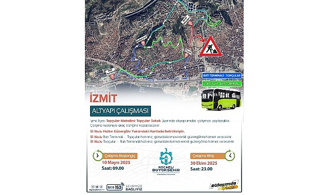Kocaeli Büyükşehir Belediyesi, İzmit Cedit Mahallesi Topçular Sokak’ta altyapı çalışması başlatıyor. Çalışma kapsamında bu yolu kullanan 51 ve 53 no’lu hatlarda güzergah değişikliği yapılacak.